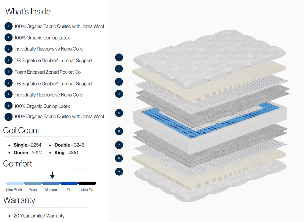Individually responsive nano coils provide precision pressure relief and spinal alignment for all sleep positions.