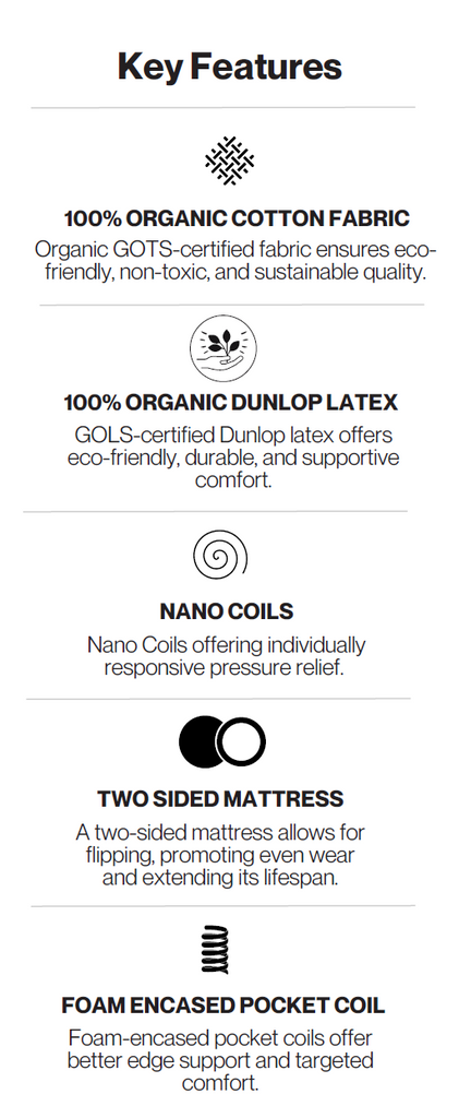 GOLS-certified Dunlop latex delivers resilient, pressure-relieving comfort with natural durability and support.